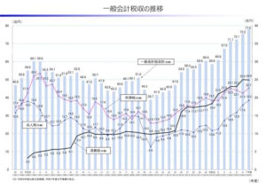 ご覧のように、所得税や法人税が上がったり下がったりギザギザを描くのに対し、消費税はビクともせず安定して線を描いていることが分かる。途中でグンと上がっている局面がいくつかあるのは、税率が上がった時だ。
